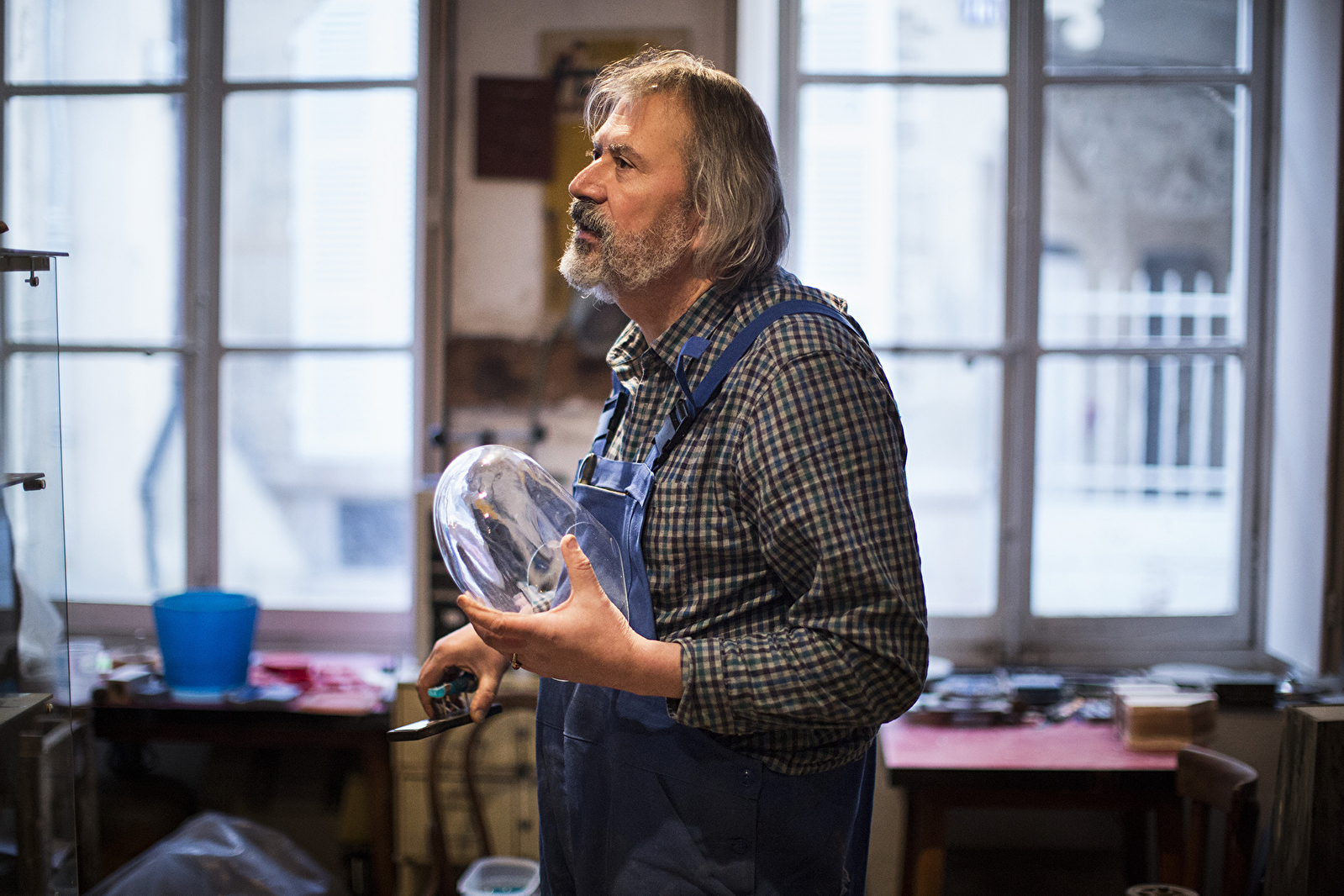 Le choix de la pâte de verre et ce bleu de cuivre, intense et lumineux, associé à des matériaux solides permettait d’explorer ce chemin.