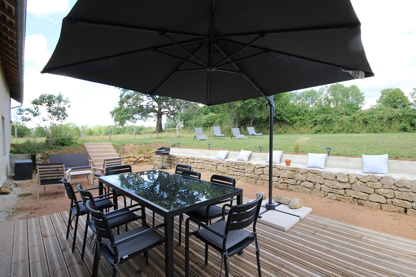 Maison individuelle avec jardin non clos, terrasse à l'arrière sans vis-à-vis avec salon de jardin et salon de détente, transats et terrain de pétanque sur le devant de la maison. Au départ d'un chemin de balade agréable. Piscine extérieure hors sol non chauffée de 2,80mx7,80m, profondeur 1,20 m, accessible selon météo de juin à septembre. Au départ d'un chemin de balade agréable.