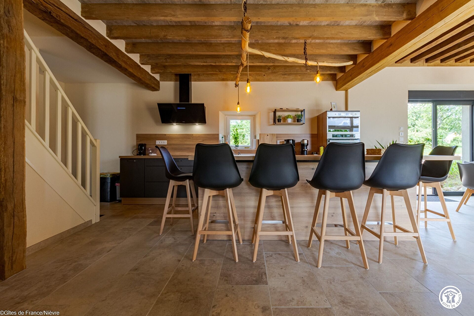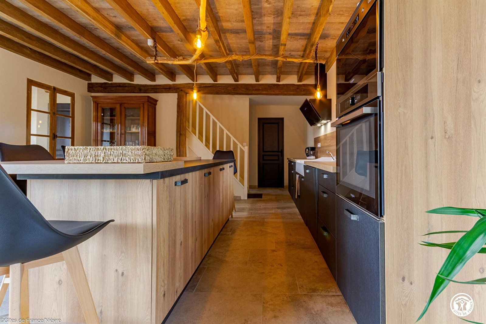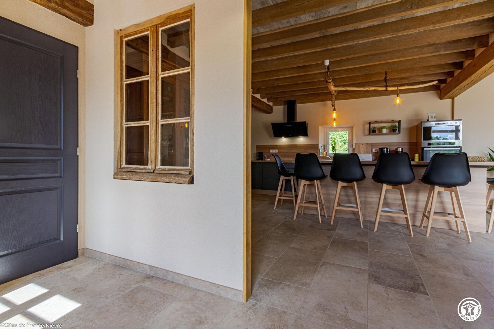 Entrée, grande pièce à vivre avec cuisine équipée et intégrée ouverte sur l'espace de vie (espace repas et coin salon avec télé et grande baie vitrée), accès direct sur l'extérieur; une arrière cuisine avec lave-linge et sèche-linge; un wc indépendant avec lave-mains; une chambre avec un lit 160x200 et sa salle d'eau privative (douche grande dimension et wc), ventilateur. Internet (fibre) dans le gîte.