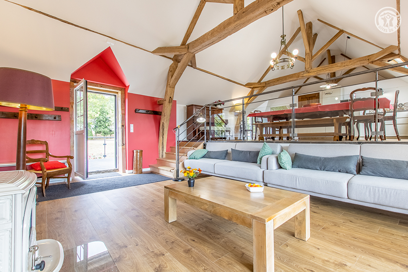 Composition : Maison avec 2 gîtes mitoyens (en verticalité), jouxtant la maison des propriétaires (indépendance totale sans vis-à-vis). Buanderie commune sur place (l-linge + s-linge). Wifi. Chauffage central bois + poêle à bois. Gîte au 1er ét. avec demi-niveau (accès plain-pied depuis parking). Séjour-cuisine-salon, 4 chambres (2 lit 1 p. 80x200cm dans chaque / 2 incluant une mezzanine accessible par échelle de meunier avec 2 lits 1 p. 70x190cm d'appoint), salle d'eau (douche), sde (douche/wc), wc indépendant. Terrasse + jardin + parking privés. Parc + local vélos en commun. Petits commerces 2 km. A noter : gîte situé en zone blanche.