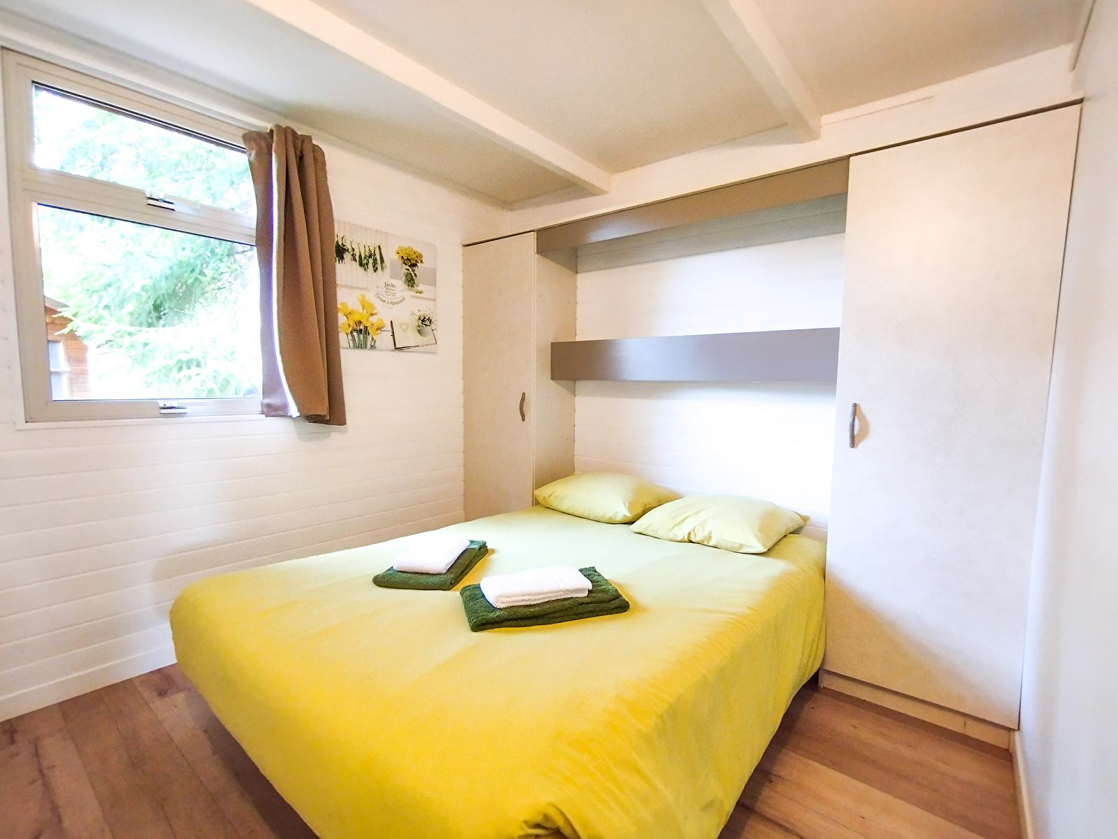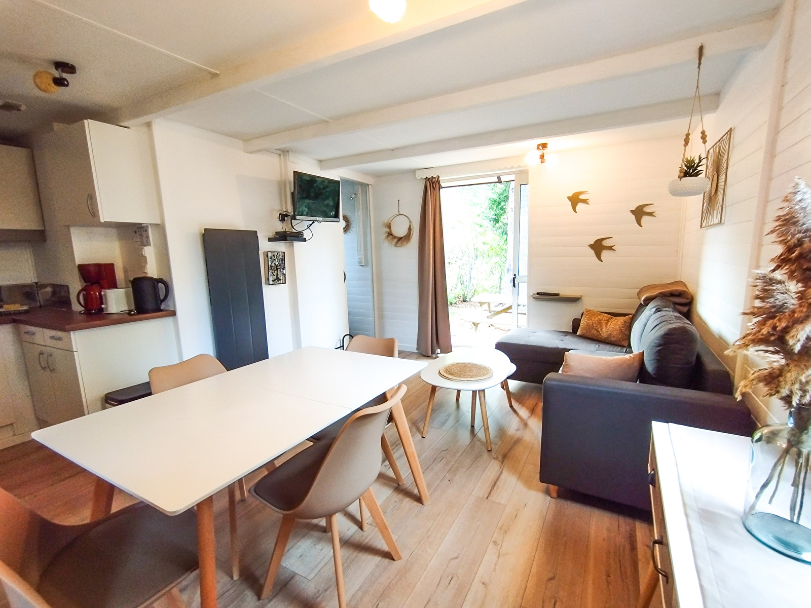 A l'abri des arbres, vous êtes au calme dans ce chalet très soigné. Avec deux chambres (1 lit double et 2 lits simples superposés de plein pied) donnant directement dans le séjour avec cuisine américaine, belle terrasse abritée, coin à manger avec grand frigo. Salle de douche et WC séparés.