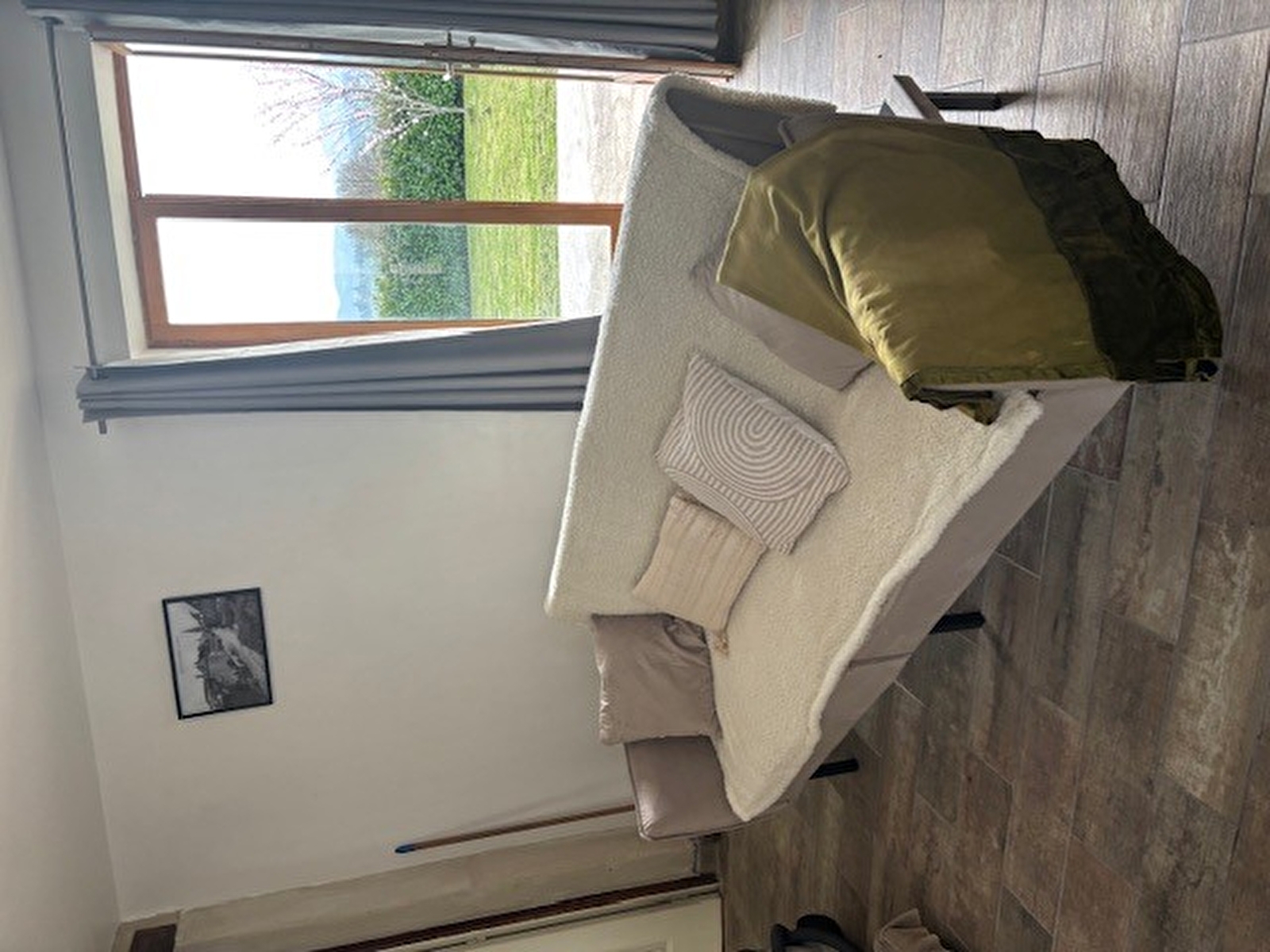 À l’étage, une chambre dispose d’un grand lit pour deux adultes et peut accueillir un lit pour enfant selon l’âge. Vous y trouverez également des placards et divers espaces de rangement. Cette chambre donne accès à une seconde terrasse avec vue sur la campagne environnante.