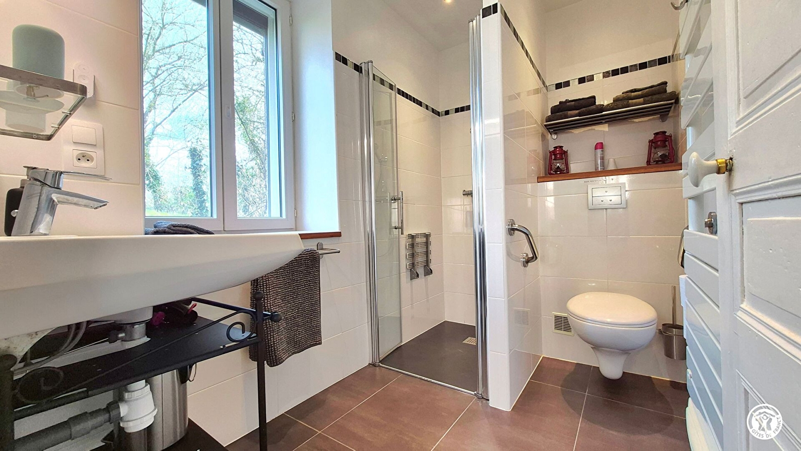 La salle d’eau est composée d’une douche à l’italienne (antidérapante et équipée d’un siège douche et barre d’appui), d’un lavabo et d’un WC (agrémenté de 2 barres d’appui), d’un sèche-cheveux et radiateur sèche-serviette. La terrasse est privative et aménagée avec une table et des chaises pour 4 personnes, un salon de jardin pour 4 personnes, 2 sièges transat, un parasol et… un barbecue pour les beaux jours !