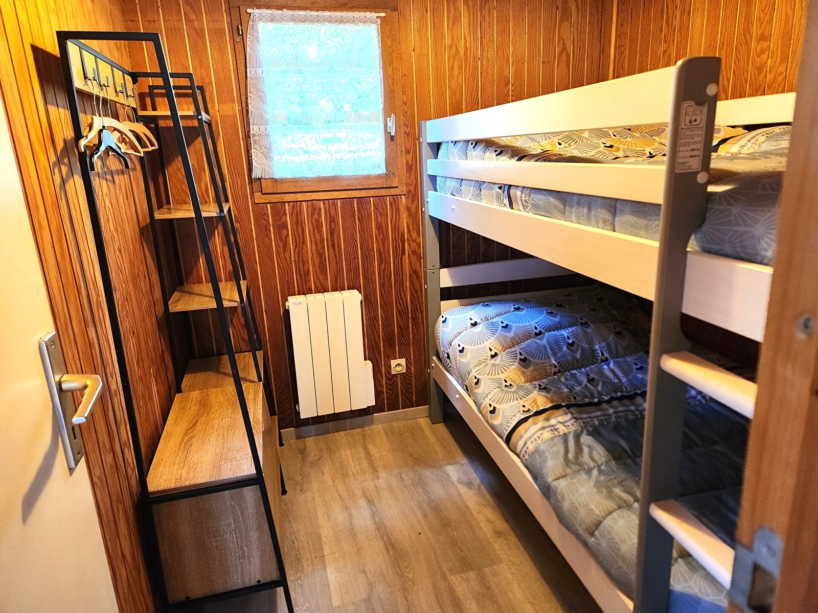Au RDC : Séjour avec canapé convertible, coin cuisine (plaque à induction + four, lave vaisselle, micro onde, combiné lave linge/sèche linge, électroménager divers, cafetière + Sanséo, TV), chambre avec lit superposés en 90, Salle de bains /WC.