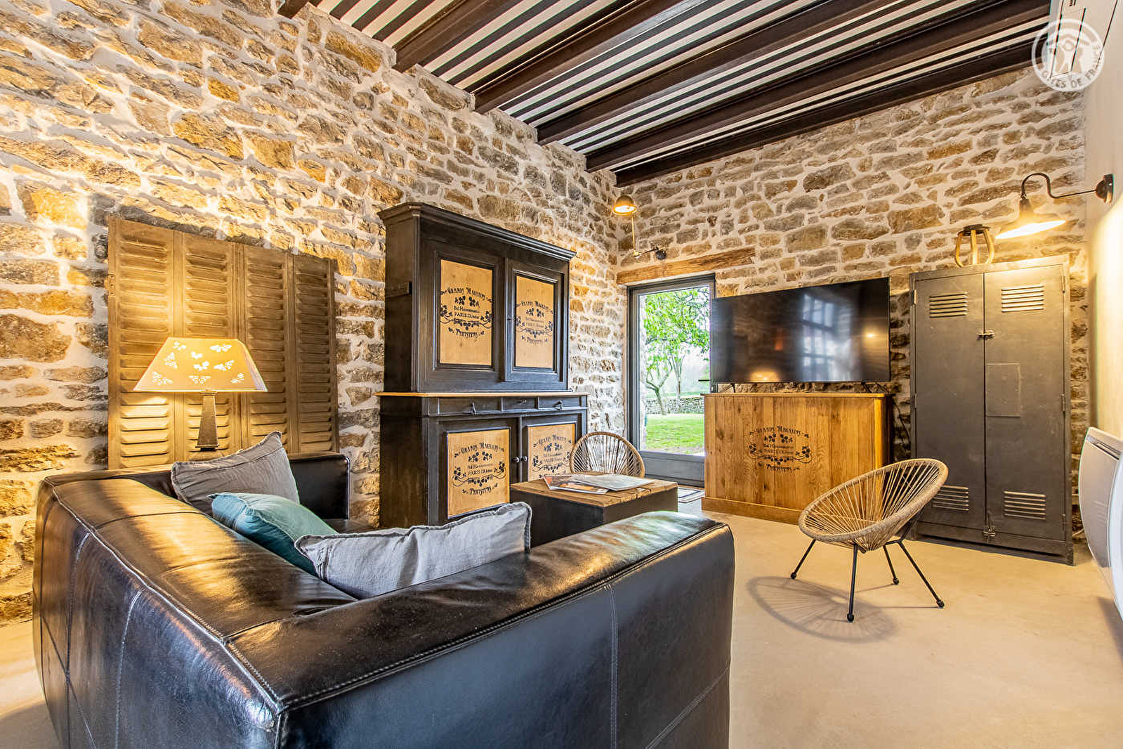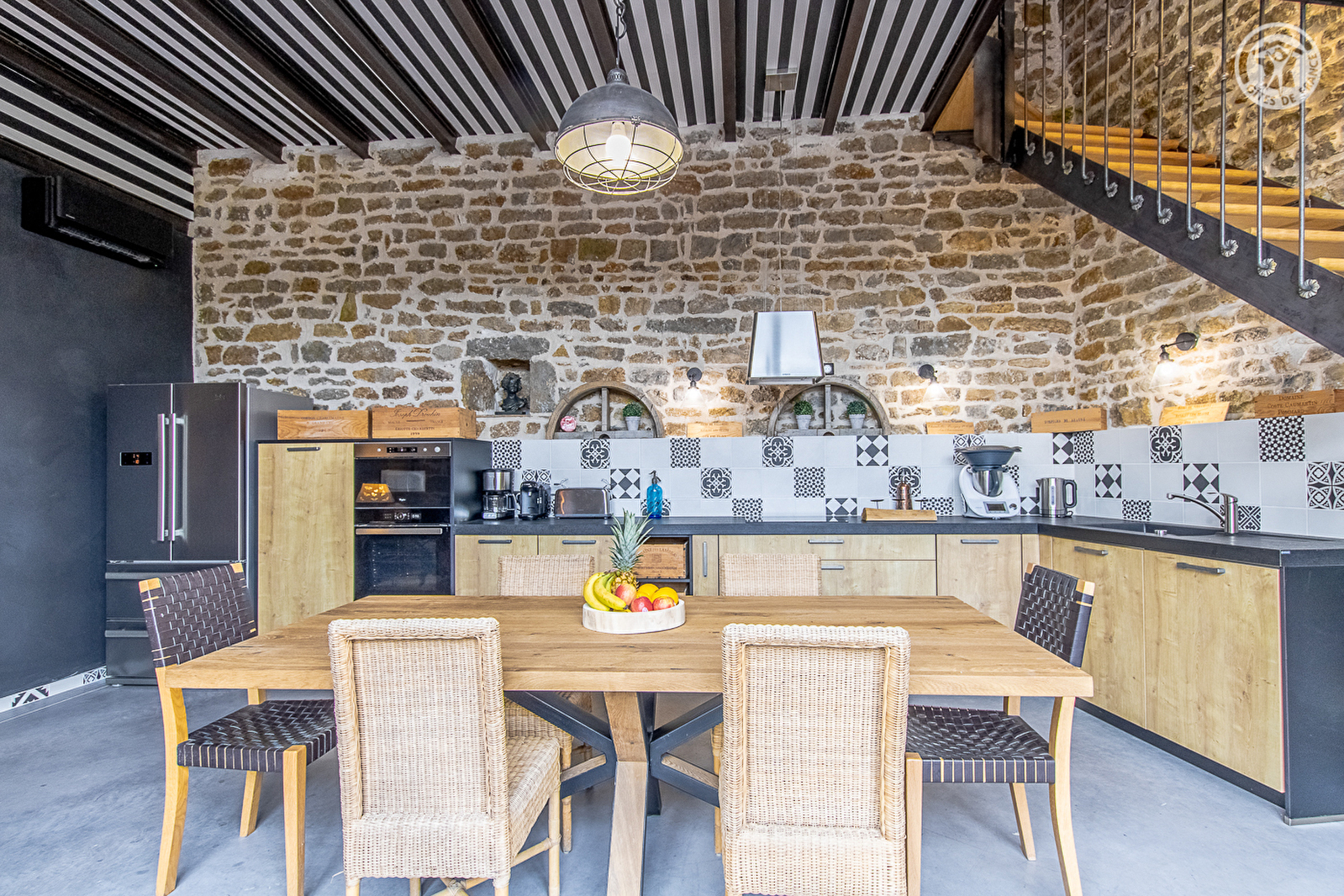 Jennifer & Éric vous ouvrent les portes d'un authentique pressoir de caractère du XIXe, soigneusement restauré dans les règles de l'art, sis sur une propriété pétrie d'histoire (ancien domaine viticole parfaitement réhabilité). Totale tranquillité en bordure de ruelle & prairie (accueillant de paisibles vaches charolaises en saisons), au cœur d'un pittoresque village viticole du Couchois blotti à flanc de coteau sud-est exposé que domine un élégant château des XIIIe & XVIe lové sur une motte féodale (comprenant un des rares ensembles, cuverie & cave, typique du XVIIIe en Bourgogne). Niché en pleine campagne sur le tracé de l'ancienne voie romaine Agrippa au creux d'un bucolique vallon de vignobles, prairies & collines boisées, le village dispose d'un patrimoine notable et jouit d'un magnifique cadre paysagé vallonnée. Spacieux gîte de grand confort. Grande pièce de vie "cathédrale" baignée de lumière par une imposante verrière. Chaleureux cachet contemporain alliant l'esprit industriel d'un littéral "loft" et ambiance "campagne & brocante chic", sublimé par les murs en pierres & linteaux en bois d'origine. Énormément de charme, style & caractère. Cosy & cocooning. Équipement complet de grande qualité. Large terrasse intimiste, exposée & ombragée, dotée d'un spa extérieur 4 places (abrité sous pergola), ouvrant sur un agréable jardin arboré & soigné bordé d'un historique mur d'enceinte (mini verger : cerisiers, pommier, poirier, pruniers…). Belle vue dégagée sur la campagne environnante.