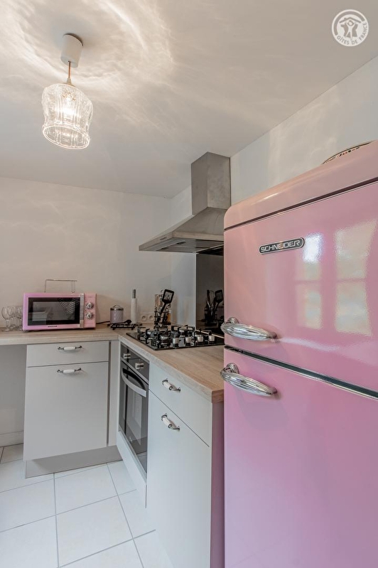 Composition : Maison mitoyenne. Wifi. Chauffage par poêle à bois. Rdc surélevé (7 marches) : cuisine, séjour-salon, 2 « espaces » chambres indépendants séparés par une ouverture communicante avec rideau (lit 2 p. 140x190cm / 2 lits 1 p. 90x190cm), salle d'eau (douche/Wc). Terrasse et cour privatives. Commerces & services 8 .5 km.
