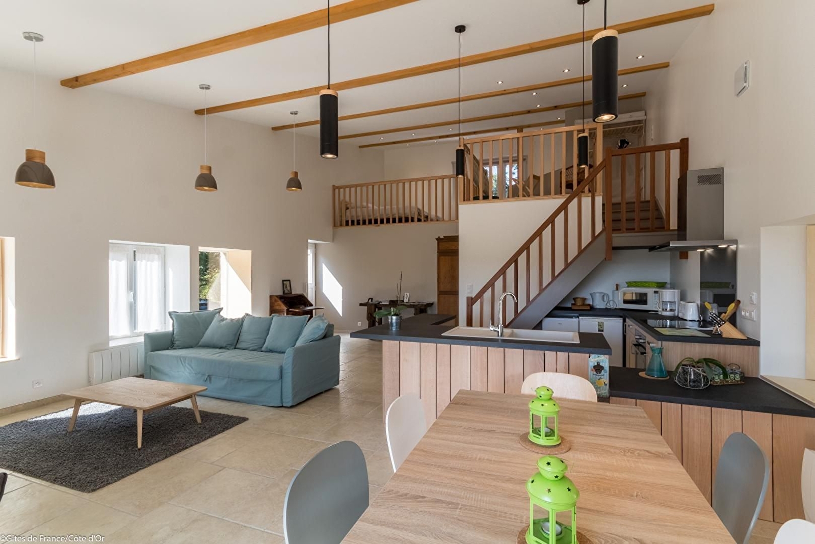 Rez-de-chaussée : grand séjour lumineux et ouvert sur le jardin, avec cuisine équipée, salon avec cheminée insert et espace salle à manger. Une chambre avec un lit 160. Salle d'eau avec douche à l'italienne et WC. 2ème chambre en mezzanine à l'étage avec 2 lits 90 jumelables et sanitaires dans la chambre (baignoire, lavabo et WC).