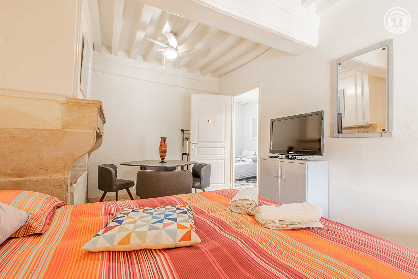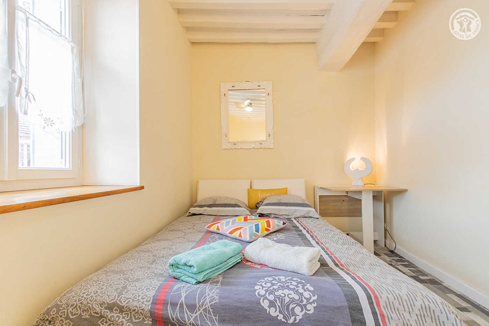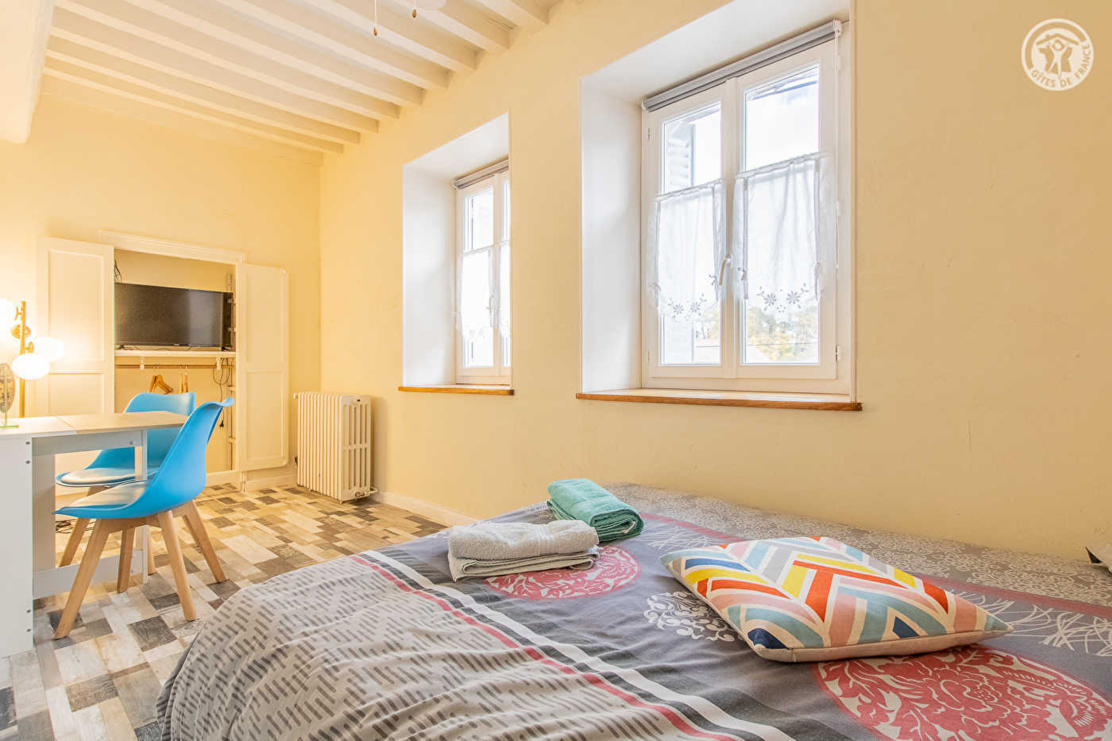 Composition : Maison comprenant le cabinet professionnel du propriétaire & 3 gîtes. Buanderie en commun au rdc (lave-linge). Wifi (fibre). Chauffage PAC. Gîte au 1er étage jouxtant un autre gîte (séparation par une porte). Espace cuisine (dans couloir), séjour-salon (canapé convertible 2 p. 140x190cm), chambre avec TV (lit 2 p. 140x200cm), sdb (baignoire + douche multijets + Wc). Mini balcon abrité privatif. Cour-terrasse en commun. Local vélos. Parking public payant sur place. Supermarché 500m. Gare 1.5 km.