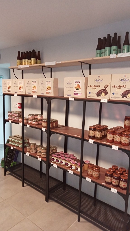 Epicerie de proximité avec dépôt de pain. Espace réservé aux produits locaux, produits frais, fruits et légumes.