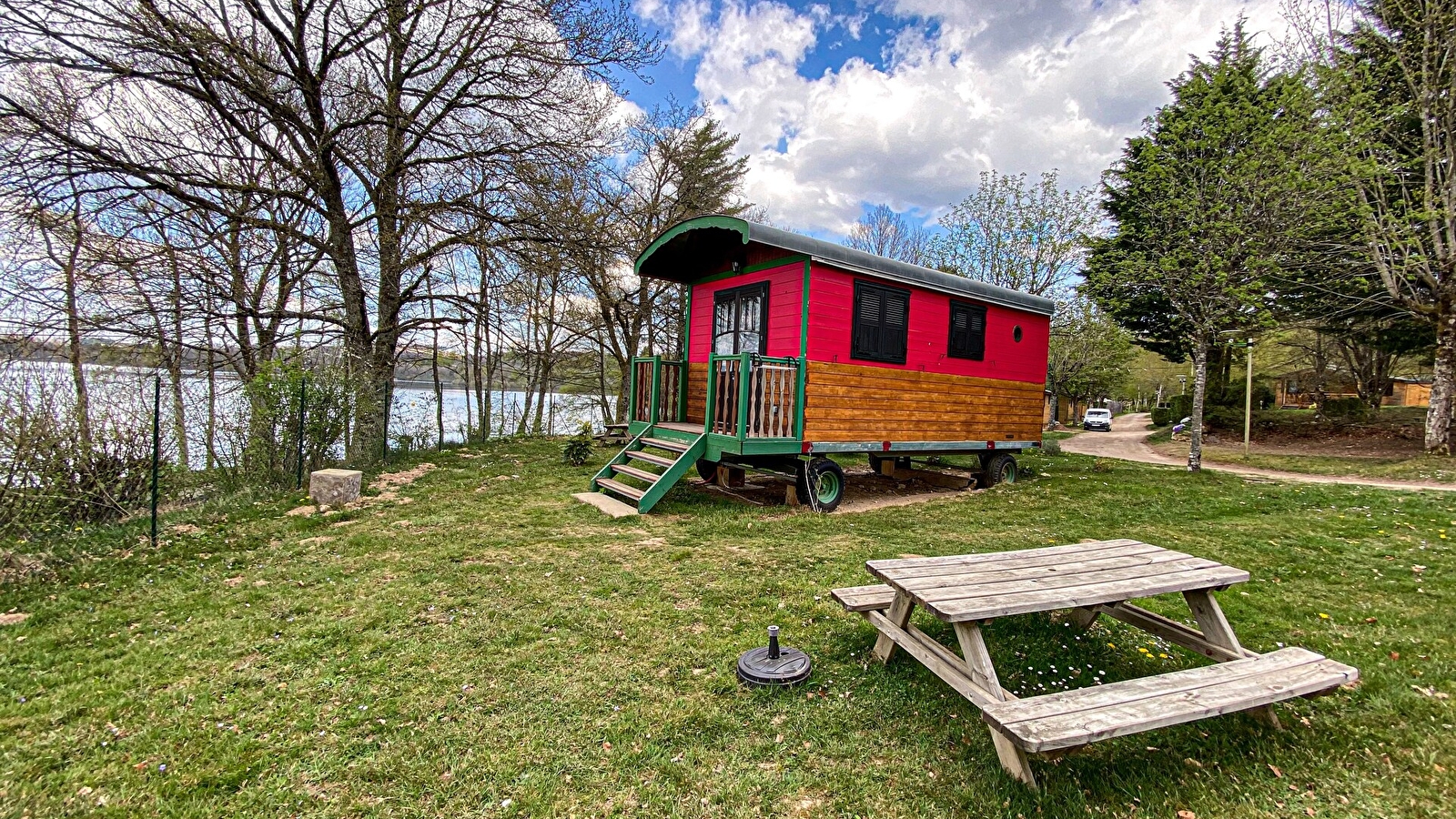 Charmante roulotte avec vue directe sur le lac, super confortable elle est tout équipée et peut accueillir jusqu'à 4 personnes.